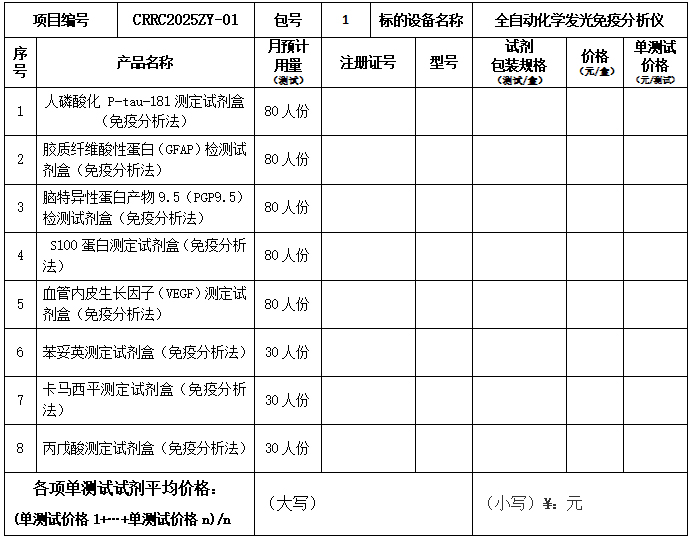 项目编号 | CRRC2025ZY-01 | 包号 | 1 | 标的设备名称 | 全自动化学发光免疫分析仪 |
