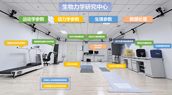 平台配备国际先进的生物力学分析设备,包括光学、无标记及惯性三维动作捕捉系统、三维测力台、足底压力步态分析跑台、足底压力测试系统、无线表面肌电测试系统、近红外脑功能成像系统、智能脊柱成像与分析系统、以及Visual 3D、Matlab等专业分析软件,构建起完整的运动学、动力学与生理学参数采集与分析能力。这些设备共同构成了系统的生物力学评估体系,可广泛应用于步态分析、运动损伤评估、康复训练效果监测、康复辅具研发等领域。
