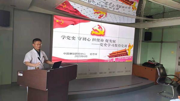 密忠祥副主任首先引用习近平总书记的讲话并强调,在全党开展党史学习教育,是党中央作出的重大决策。“在庆祝我们党百年华诞的重大时刻,在全党集中开展党史学习教育,正当其时,十分必要。”他从开展党史教育活动的重大意义、学习党史的原则、党史教育的重要内容、党史教育活动要实现的目标和全面推动康复事业高质量发展等五方面内容,深入浅出地进行了讲授,为在场的党员干部理清了党史学习教育的重点和思路。密忠祥副主任强调,中国特色社会主义进入新时代以后,对残疾人事业尤其是现代康复事业提出了新的要求。作为全国8500万残疾人的代表者、服务者和管理者,我们应该以党史学习教育为契机,守住全心全意为残疾人服务的初心,勇担历史赋予的使命,全力推动残疾人康复事业全面快速高质量发展,并提出三点要求:一是加强内部资源整合,提高“两个效益”,练好内功,综合提升中康核心竞争力,占领新的事业制高点,引领康复事业的可持续发展;二是要发挥中康业务优势,结合健康中国战略和老龄化社会发展特点,积极展技术创新,持续保持康复引领地位;三是推动康复技术标准化建设,加快康复人才培养,做好人才储备等工作。